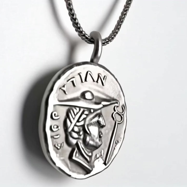 Χειροποίητο από καθαρό ασήμι 1000 σε ένα παραδοσιακό ελληνικό χωριό, αυτό το εντυπωσιακό κρεμαστό αποτυπώνει την ακατέργαστη, αυθεντική υφή των αρχαίων νομισμάτων με το όμορφα πατινιασμένο φινίρισμα του. Το εντυπωσιακό νόμισμα κρέμεται από μια κομψή 60 εκ. στριφτή αλυσίδα από ασήμι 925 που συμπληρώνει την κλασική κομψότητα του κομματιού.